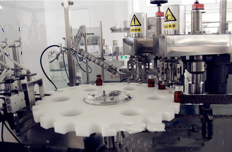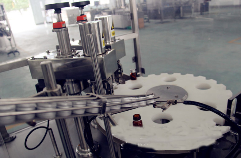 該西林瓶灌裝壓塞鎖蓋機集自動進瓶、理蓋、上蓋、抽吸真空、旋蓋、出瓶于一體,生產(chǎn)效率高,運行穩(wěn)定可靠;西林瓶灌裝壓塞鎖蓋機的真空度可按需要設(shè)定,使用旋合式旋蓋原理和全密封真空式結(jié)構(gòu);該西林瓶灌裝壓塞鎖蓋機自動化程度高,設(shè)計合理,主要是由瓶子輸送、理蓋、夾瓶掛蓋、旋蓋、電控等機構(gòu)和抽真空系統(tǒng)組成;此西林瓶灌裝壓塞鎖蓋機能耗低、適應(yīng)性好,旋蓋機構(gòu)高度可調(diào)節(jié),適應(yīng)相同口徑、不同高度的瓶子旋蓋;更換部分零件即可實現(xiàn)不同瓶徑、不同口徑的旋蓋,更換快捷方便;夾瓶子的托爪帶有膠墊,真空罩、旋蓋、配蓋機構(gòu)都是氣缸驅(qū)動,在使用過程中都能做出精確調(diào)整,動作靈活;送蓋機構(gòu)有光電感應(yīng)安全保護裝置,可實現(xiàn)無蓋開機送蓋,蓋滿關(guān)機不送蓋;